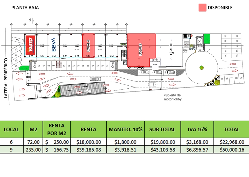 Cuenta con acceso y salida por ambos costados de la plaza.
