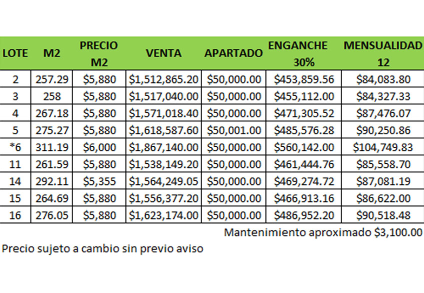 - Mantenimiento pagadero a partir de la entrega del lote con uso de las amenidades.